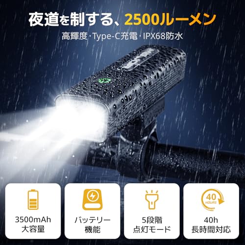 効果的 自転車 ライト 防水 充電式 【2500ルーメン高輝度・モバイルバッテリー機能付】 自転車用ライト 明るい 強力 防水IPX68 防振 自転車ヘッドライト 充電式 小型 5段階点モード LED クロスバイク ロードバイク 自転車らいと防水 ライト 180°大ワイド照明 簡単取付け 懐中電灯兼用 通勤 通学 PSE認証済 (ブラック) 実績 ショップ:Amazon