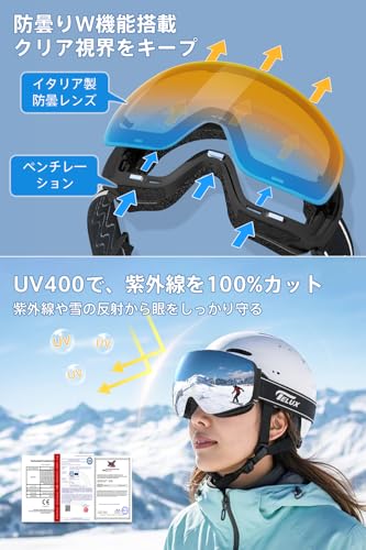 当社のスキーゴーグルは、高品質な二重レンズを採用。外層は耐久性の高いPCレンズ、内層はイタリア輸入の高性能防曇レンズです。なお、2つのレンズの間にある空気層により、レンズ内外の温度差を減少させ、急激な温度変化でも曇りにくく、常にクリアな視界を維持します。UV400で有害な紫外線を完全に遮断し、目を守りつつ高い光線透明性を提供します。球面レンズデザインは視野を広げ、視野の歪みを最小限に抑えることで、周囲の状況を素早く把握可能。 - メーカー: Geekin